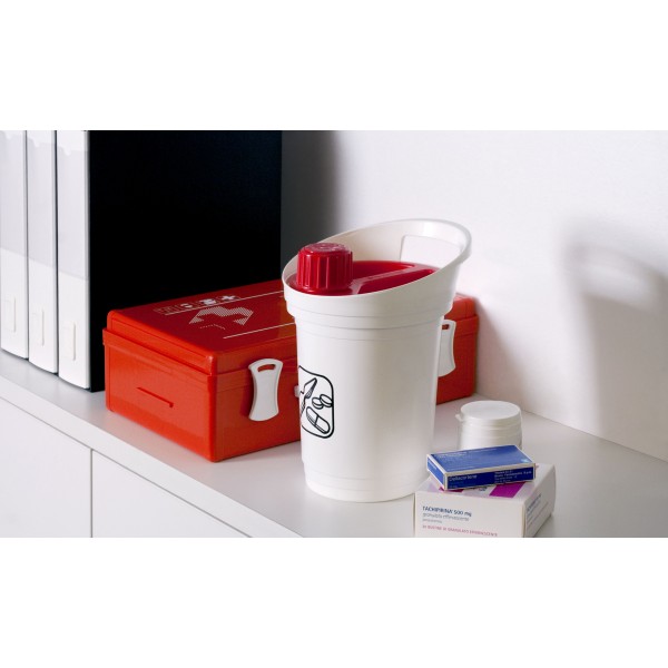 The use of special technology that makes it difficult for children to access the container for expired drugs means that it can be placed in a place accessible to everyone. The chute located in the cap only opens after simultaneous pressing and turning. To empty the waste container, the entire cap (cover) must be turned. Drugs, even after their expiration date, should be kept in a shaded place, hence the container has a white, opaque body and a reinforced bottom.