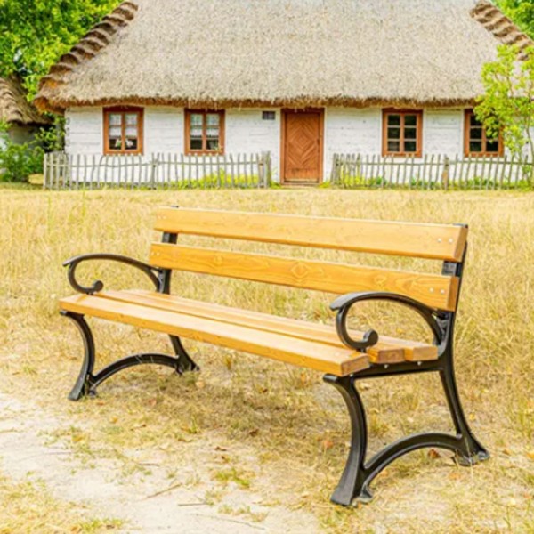 The representative wooden garden bench has a structure made of an exceptionally durable material - cast iron. The wooden slats have been protected with varnish or acrylic paint. It is characterized by anti-corrosion properties and resistance to atmospheric conditions. Despite being installed outdoors, it maintains an aesthetic appearance and good technical condition. The wooden bench with backrest remains resistant to the negative effects of sunlight, rainwater, snow, or extreme temperatures.