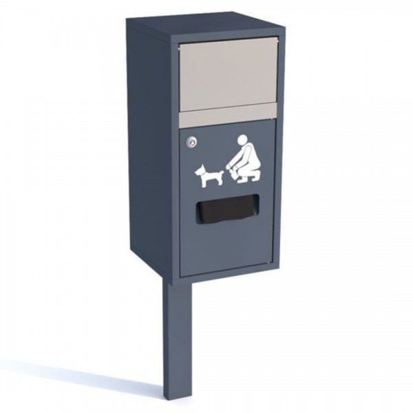 The dog waste container comes standard in graphite color (RAL 7021), but is also available in other colors from the RAL palette. It has a stainless steel flap and a feces bag dispenser. It provides 2 ways of mounting to the substrate.