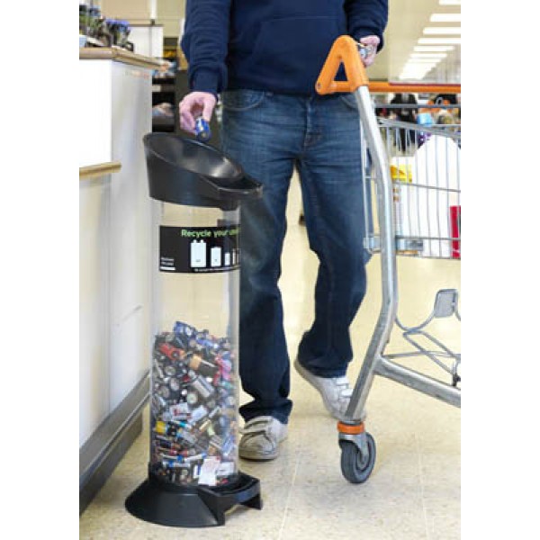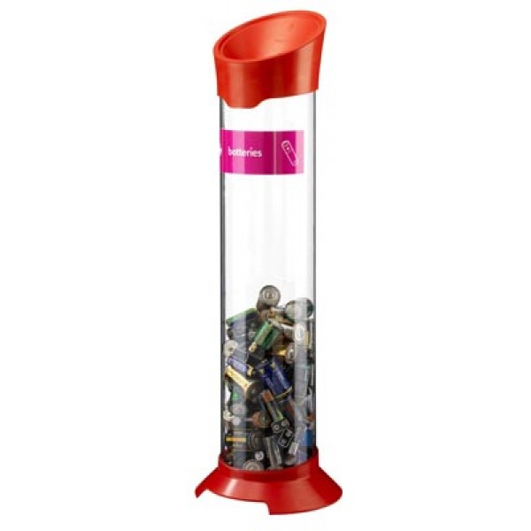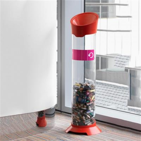 The used battery container is characterized by small dimensions. It is equipped with a practical base, which in combination with the tube form provides full stability. On top there is a throw-in hole kept in the same color scheme designed for throwing small waste, such as batteries or accumulators. The battery bin is characterized by a construction limiting access to the interior. The transparent housing allows for ongoing control of the filling level to take care of its emptying in time.