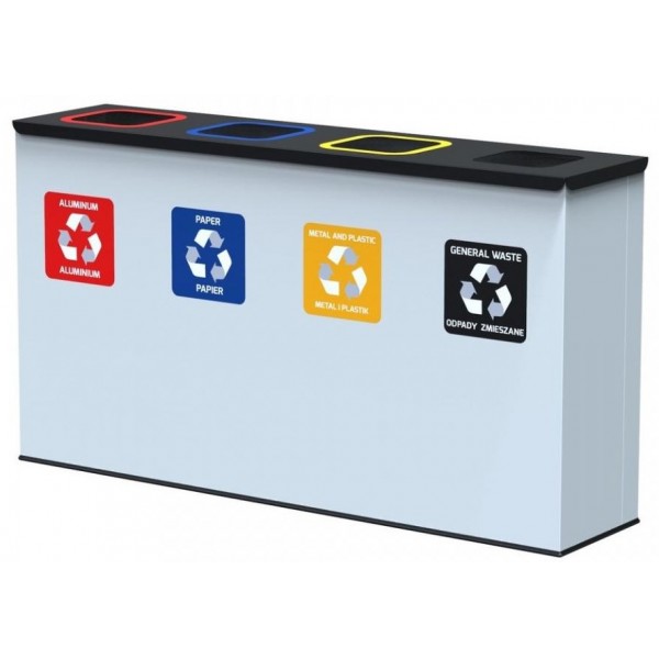 Segregation station Eko Station has many conveniences. One of them is the use of special powder paint protecting against microorganisms. Significant for hygiene is the use in the production process of metal ion compounds, which inhibit microorganisms and bacteria. The antibacterial coating of the waste container remains effective for many years, and its operation is confirmed by the certificate PN-EN ISO 846:2002. The protective layer works as long as the paint on the waste bin is not damaged. Waste segregation stickers mark the appropriate segregation fractions. Frames at the throw-in holes also indicate the type of waste collected in the container. The waste bin housing is made in white (RAL 9010), and the cover in black (RAL 9005).